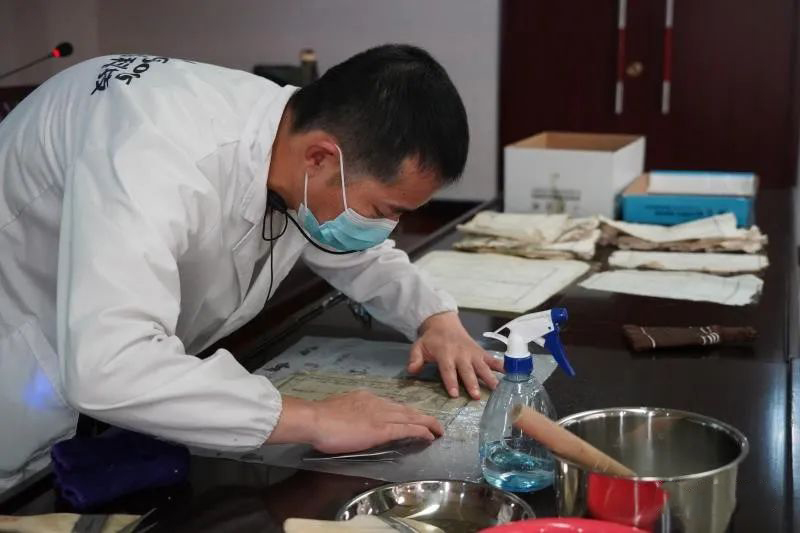 修裱組組長(zhǎng)任勤正在做檔案修裱實(shí)操演示